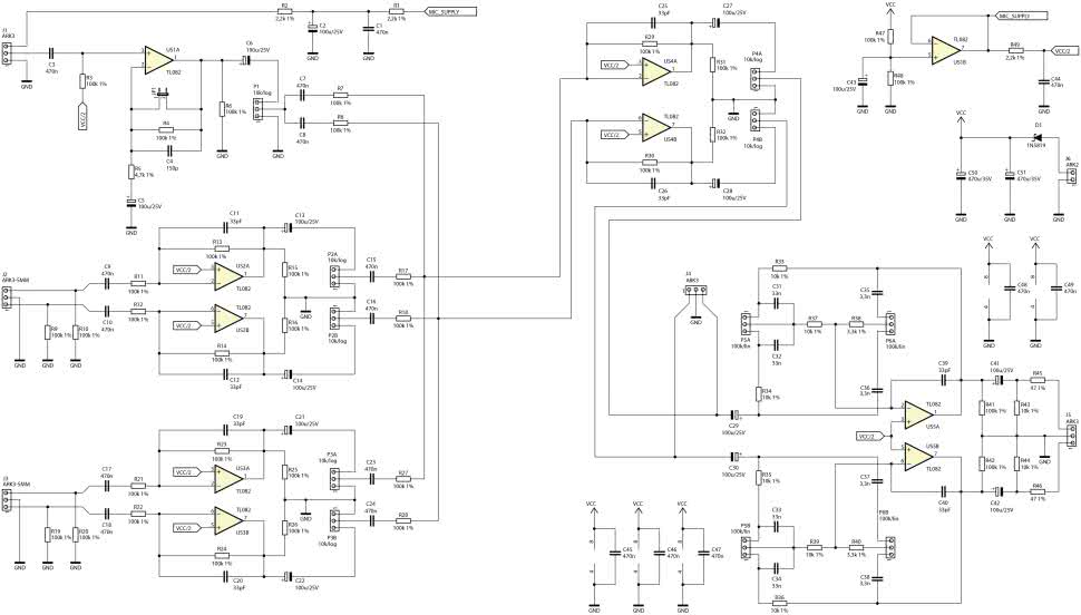 Po unormowaniu impedancji wyjściowej każdego ze źródeł sygnału i/lub jego wzmocnieniu przez przedwzmacniacz mikrofonowy, sygnały są dzielone przez potencjometry i trafiają do sumatora sygnałów. Aby nie przenikały one między sobą wzajemnie, użyto sumatora w postaci wzmacniacza odwracającego, ponieważ w punktach podłączonych do wejść odwracających układów US4A i US4B potencjały powinny się (teoretycznie) trzymać stałej wartości, niezależnie od przyłożonego sygnału, ponieważ wynika to z warunku pracy wzmacniacza operacyjnego objętego ujemnym sprzężeniem zwrotnym. Zatem wszystkie te trzy sygnały będą spływały do punktów, które one będą traktowały jako wirtualną masę o niezmiennym potencjale. Ma to jeszcze sens pod tym względem, że bufory wejściowe na wcześniejszym etapie torów przetwarzania sygnału mają charakter odwracający i tutaj również mamy wzmacniacz o charakterze odwracającym – faza sygnału między wejściem a wyjściem pozostanie zatem bez zmian.