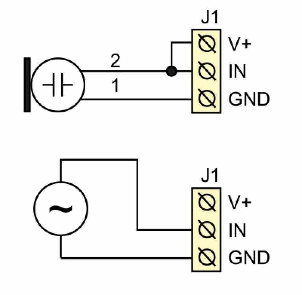 Do zacisków złącza J1 można podłączyć zarówno mikrofon elektretowy (bez przedwzmacniacza), jak i źródło sygnału z tzw. wyjściem liniowym. Rysunek 3 obrazuje, co i gdzie należy podłączyć w jednym i drugim przypadku. Podczas pracy z mikrofonem zworka JP1 powinna być rozwarta, zaś kiedy nie potrzeba dodatkowego wzmocnienia – zwarta. Do zasilania mikrofonu jest używane napięcie równe połowie napięcia zasilającego. Typowe mikrofony elektretowe potrzebują napięcia nie wyższego niż 10 V, w takiej sytuacji układ powinien być zasilany napięciem o wartości 20 V lub niższej. Warto zwrócić na to uwagę, by nie uszkodzić swojego przetwornika.