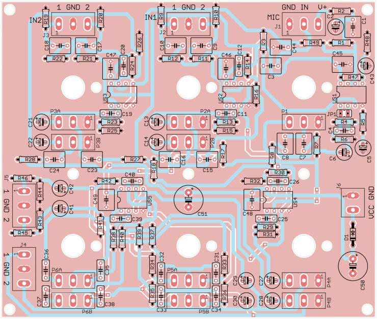 Układ został zmontowany na dwustronnej płytce drukowanej o wymiarach 130 mm × 110 mm. Jej wzór ścieżek oraz schemat montażowy przedstawia rysunek 2. Warto zauważyć, że wszystkie elementy są montowane od „spodniej” strony płytki, przez co na górnej znajdują się wyłącznie pokrętła potencjometrów.