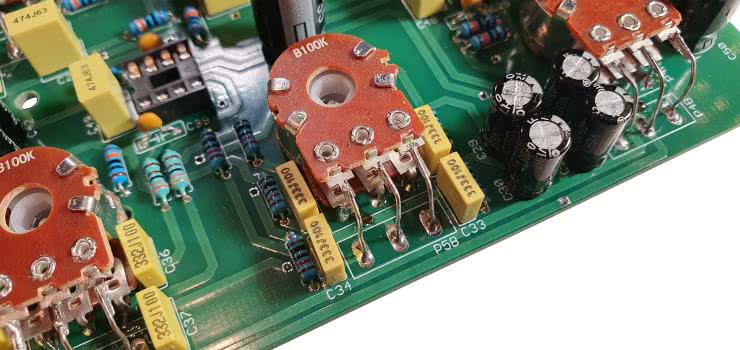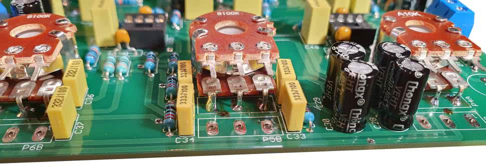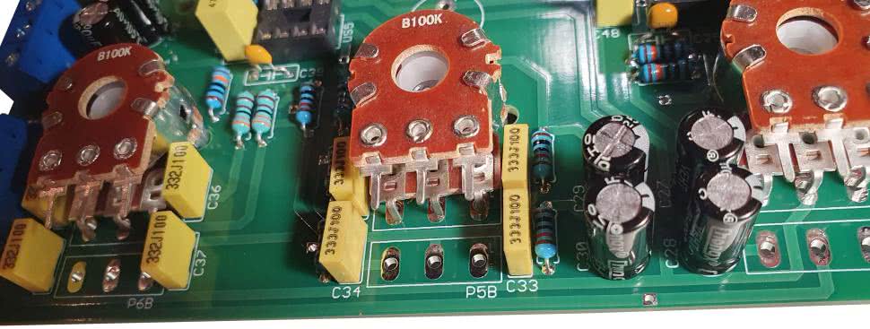 Kilka słów wymaga sposób montażu potencjometrów, który to proces celowo polecam zostawić na sam koniec, upewniając się co do poprawności montażu pozostałych podzespołów. W pierwszej kolejności należy zagiąć ich wprowadzenia pod kątem 90º w stronę osi i przykręcić do płytki. Ale tutaj uwaga – w przypadku potencjometrów podwójnych wymóg ten dotyczy tylko tych wyprowadzeń, które są bliżej osi. Ilustruje to fotografia 2.
