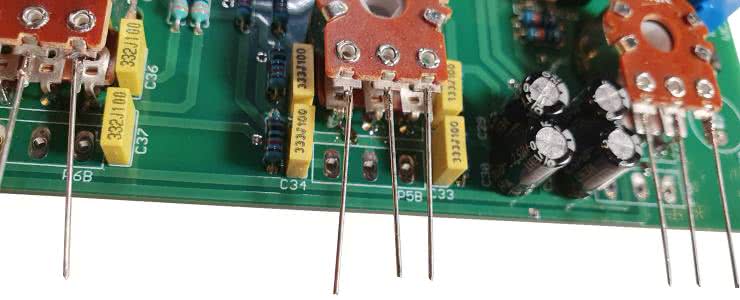 Teraz można te zagięte wyprowadzenia przylutować do pól lutowniczych, nie żałując przy tym spoiwa lutowniczego – niech się trzymają porządnie, wszak szarpanie potencjometrami podczas obsługi tego typu urządzeń to norma. Efekty można zobaczyć na fotografii 3.