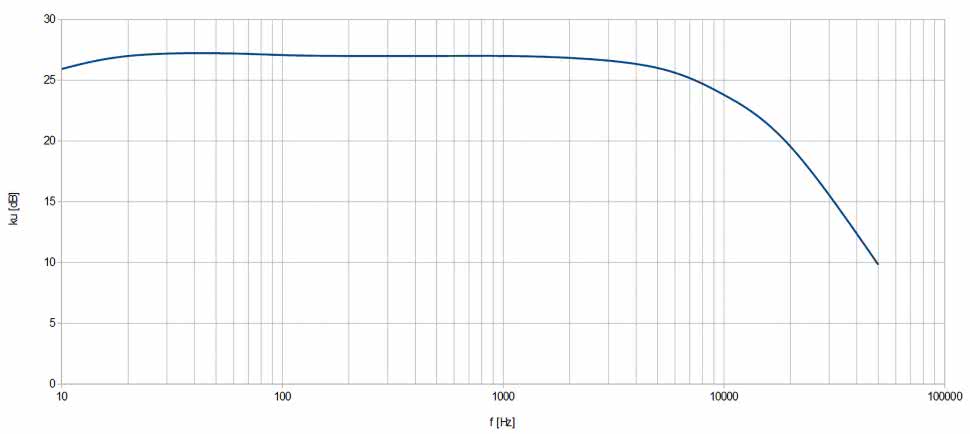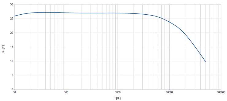 Druga charakterystyka została wykreślona po podaniu napięcia 20 mVpp na wejście mikrofonowe i ustawieniu pokrętła głośności MICROPHONE na maksimum – pozostałe warunki bez zmian. Wzmocnienie w paśmie przepustowym można uznać za stałe, wynoszące 27 dB, które zaczyna spadać dla częstotliwości powyżej 10 kHz – rysunek 6. Przy użyciu tego wejścia jako bufora, bez wzmocnienia, pasmo pracy będzie znacznie szersze ponieważ zostanie zwarty kondensator C4, zawężający szerokość owego pasma.