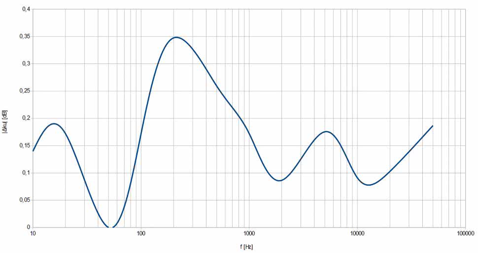 Pierwsza zmierzona charakterystyka miała na celu oszacowanie nierównomierności między dwoma kanałami tego samego wejścia. Na oba zaciski wejścia INPUT 1 podano ten sam sygnał o wartości międzyszczytowej 400 mV i zmieniającej się częstotliwości. Pokrętła głośności INPUT 1 i MASTER były ustawione na maksimum, zaś BASS i TREBLE w połowie. Różnica między uzyskanymi wzmocnieniami w obu kanałach została pokazana na rysunku 5, przy czym jest to wartość bezwzględna różnicy miar wyrażonych w skali decybelowej. Efekt jest nader dobry – różnica nie przekracza wartości 0,35 dB, czyli można ją uznać za nieistotną z punktu widzenia jakości odsłuchu.
