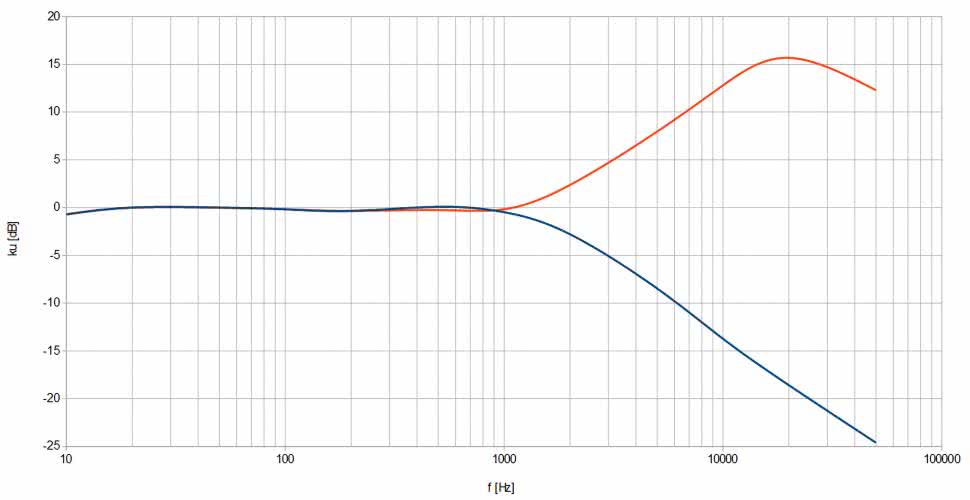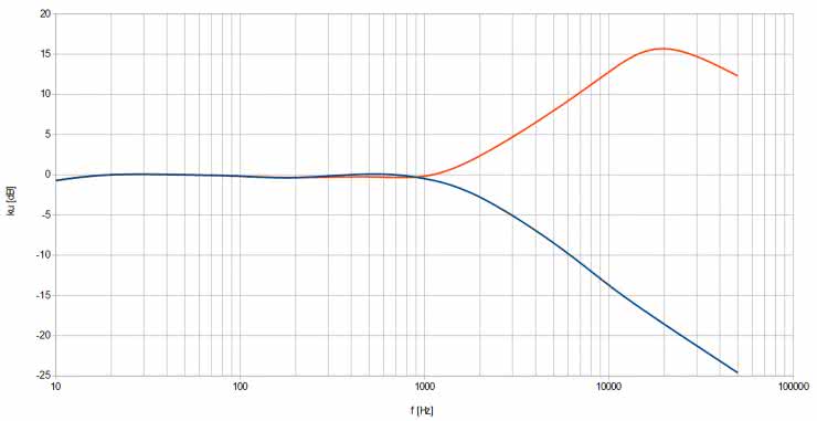 Z kolei wpływ regulacji potencjometrem TREBLE (BASS w połowie) można zobaczyć na rysunku 8. Kolory linii są takie same, jak na poprzednim wykresie. Skrajnie prawe położenie – podbicie, czyli linia czerwona – umożliwia zwiększenie wzmocnienia wysokich tonów o około 15 dB. Z kolei stłumienie, obrazowane przez linię niebieską, również może sięgać około 15 dB na krańcu pasma częstotliwości słyszalnych. Tutaj z kolei widać wpływ tego filtru przy częstotliwościach wyższych od 1 kHz.