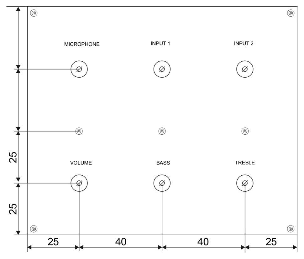 Układ został tak zaprojektowany, by stanowił zwartą całość. Jego płytkę można przykręcić do powierzchni czołowej dowolnej obudowy, wykorzystując do tego celu otwory montażowe oraz śruby mocujące potencjometry. Otworów montażowych jest łącznie siedem, z których cztery są umieszczone w rogach, w odległości 3 mm od krawędzi płytki. Lokalizację pozostałych trzech otworów oraz osi potencjometrów można odczytać z rysunku 4. Obudowy potencjometrów są połączone z masą układu, rozlaną na całej powierzchni płytki, za sprawą odsłoniętych spod maski lutowniczej obszarów wokół nakrętek mocujących ich osie.