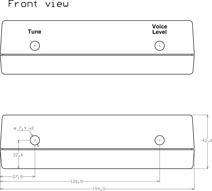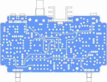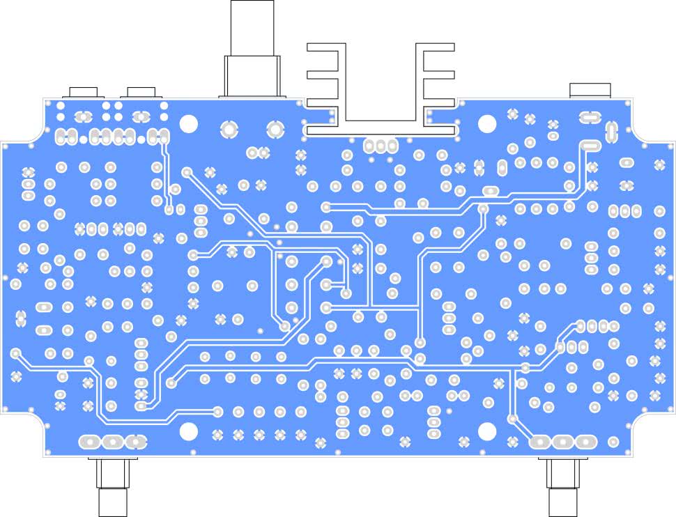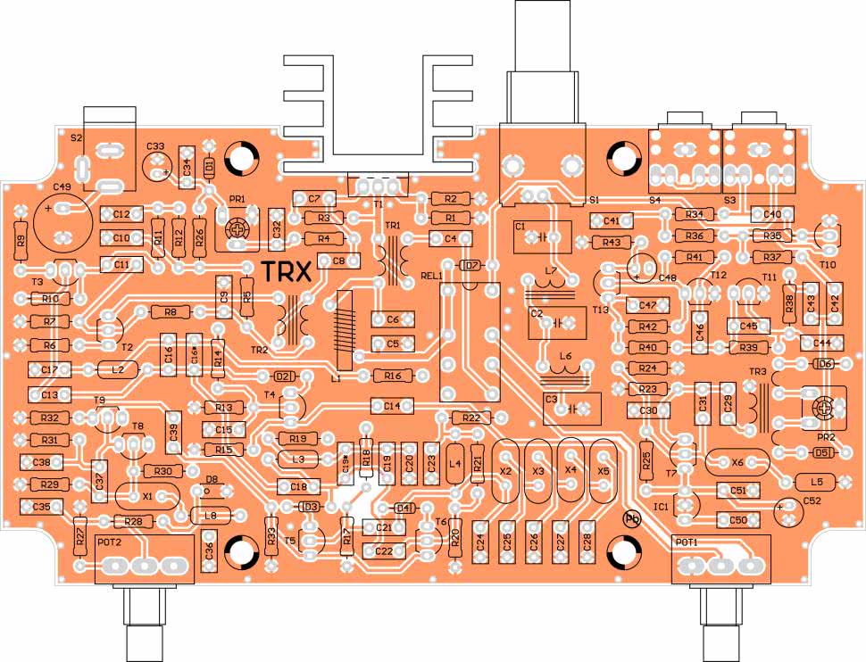 Docelowy układ minitransceivera został zmontowany na profesjonalnie przygotowanej, dwustronnej płytce drukowanej AVT6066 (rysunki 3a i 3b), przystosowanej do dostępnej na rynku, tworzywowej obudowy ABS Z78 (85×154×43 mm). Składa się ona z dwóch części, a łączenie dolnej i górnej pokrywy odbywa się za pomocą czterech wkrętów. Przednia ścianka zawiera dwa otwory przystosowane do przykręcenia potencjometrów: POT 1 z prawej strony (tłumik) i POT2 z lewej (strojenie).