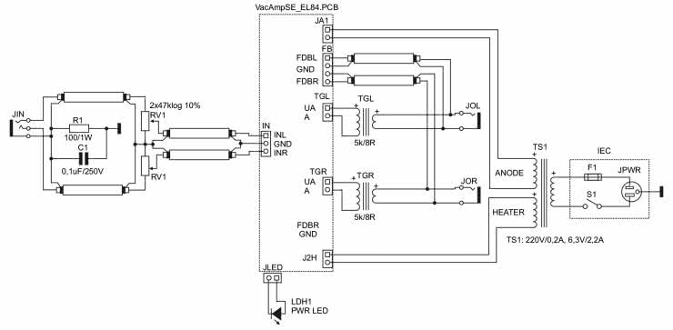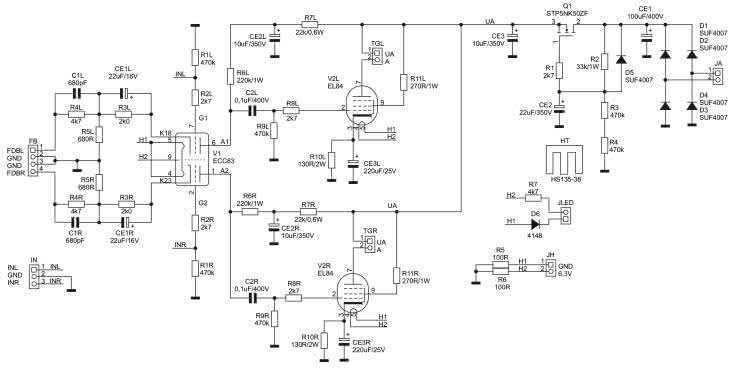 - V2L,V2R: EL84 (lampa EL84 z podstawką noval do druku)