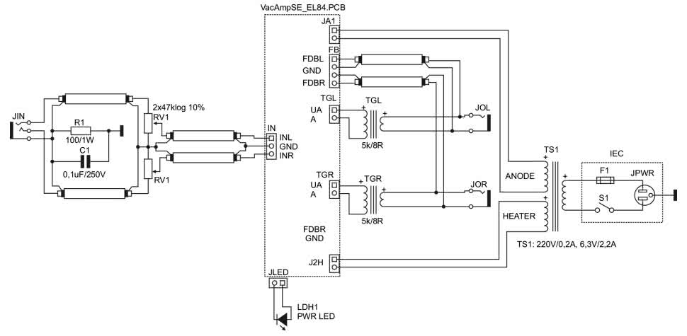 Sygnał wejściowy z gniazda JIN doprowadzany jest do potencjometru regulacji głośności RV1, a stąd do złącza IN na płytce wzmacniacza. Dalej, już bez kondensatora separującego składową stałą (praktycznie wszystkie urządzenia mają separację, więc nie ma sensu jej powielać), sygnał trafia na siatkę sterującą triody V1 poprzez rezystor „antywzbudzeniowy” R2L. V1 pracuje w układzie polaryzacji automatycznej – do wytworzenia ujemnego napięcia na siatce sterującej, ustalającego punkt pracy, stosowany jest spadek napięcia, jaki wywołuje przepływ prądu anodowego przez rezystor katodowy R3L+R5L. Wzmocniony sygnał wejściowy wysterowuje – poprzez kondensator C2L (separujący składową stałą) – siatkę pentody V2L. R8L, podobnie jak wcześniej, pełni funkcję antywzbudzeniową (tworzy z pojemnością wejściową lampy filtr dolnoprzepustowy). Wzmacniacz objęty jest pętlą globalnego sprzężenia zwrotnego R4L/C1L. Elementy R7L i CE2L zapewniają dodatkową filtrację napięcia zasilającego stopnie wstępne.