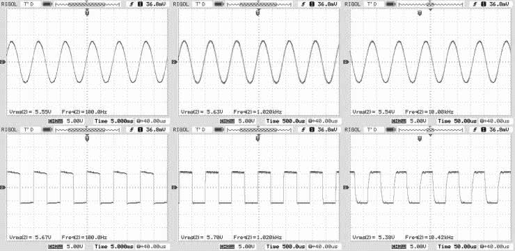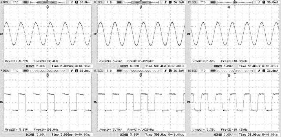 Przykładowe przebiegi uzyskane podczas testów przedstawia rysunek 6. Pokrywają się całkowicie z wynikami pomiarów zniekształceń.