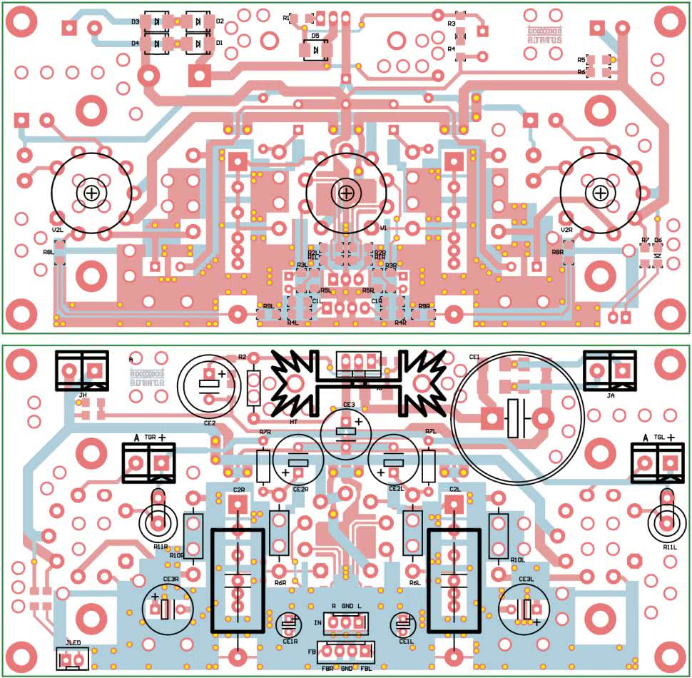 Wzmacniacz zmontowany jest na dwustronnej płytce drukowanej – rozmieszczenie elementów pokazują rysunki 5a i 5b. Aby umożliwić odpowiednie wyeksponowanie lamp, podstawki montowane są na warstwie TOP, na której nie ma innych wystających elementów. Ułatwia to mocowanie płytki do górnej części obudowy wzmacniacza za pomocą kołków dystansowych o długości 10...12 mm. Wszystkie gniazda połączeniowe płytki są łatwo dostępne od spodu obudowy.
