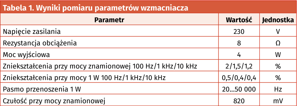 Pomimo prostoty układu, wzmacniacz ma przyjemne brzmienie i całkiem znośne parametry – patrz tabela 1.