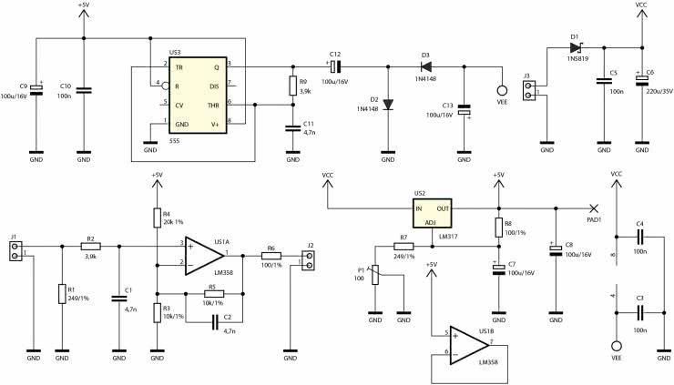 Układ LM358 może teoretycznie pracować przy asymetrycznym zasilaniu, jednak pojawia się wtedy problem z uzyskaniem zerowego napięcia na wyjściu. Aby poprawić parametry urządzenia w zakresie niskich napięć wyjściowych, do układu dodany został prosty generator napięcia ujemnego. Znany, popularny i nadal lubiany układ typu 555 pracuje w roli generatora astabilnego o wypełnieniu impulsów wyjściowych około 50%. Z uwagi na maksymalne napięcie zasilania równe 18 V jest on zasilany przez opisany już wcześniej stabilizator. Wyjście tego układu czasowego steruje prostym, diodowo-kondensatorowym odwracaczem napięcia, dając napięcie wyjściowe na poziomie około –3 V. To niewiele, ale w pełni wystarczy do poprawienia pracy układu LM358 przy niskim wysterowaniu wyjścia.