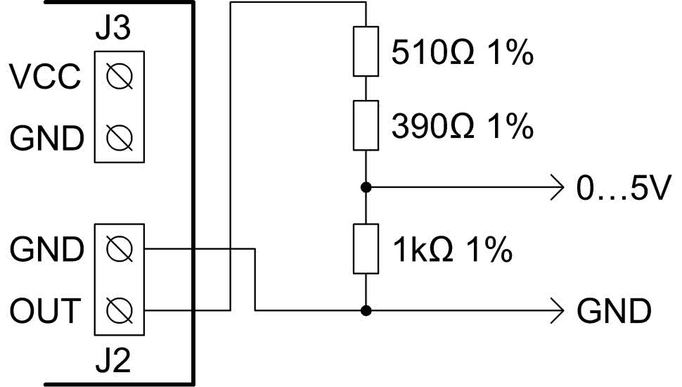 w celu uzyskania kompatybilności ze standardem 0…5 V (rysunek 3). Zaproponowane wartości elementów zapewniają równy podział napięcia przez 2, ponieważ „górna” gałąź owego dzielnika zawiera rezystory o wypadkowej rezystancji mniejszej o 100 Ω od „dolnej” gałęzi. Rezystancja wyjściowa takiego tworu wynosi 500 Ω i będzie wystarczająca w większości zastosowań, na przykład do sprzęgnięcia z wejściem przetwornika analogowo-cyfrowego mikrokontrolera. Można też dokonać innej modyfikacji tego układu. Aby jego wyjście napięciowe zmieniało się w granicach 0…5 V, wystarczy wymienić rezystory R3 i R4 na 30 kΩ o tolerancji 1%. Wówczas rezystancja wyjściowa będzie wciąż na poziomie 100 Ω.
