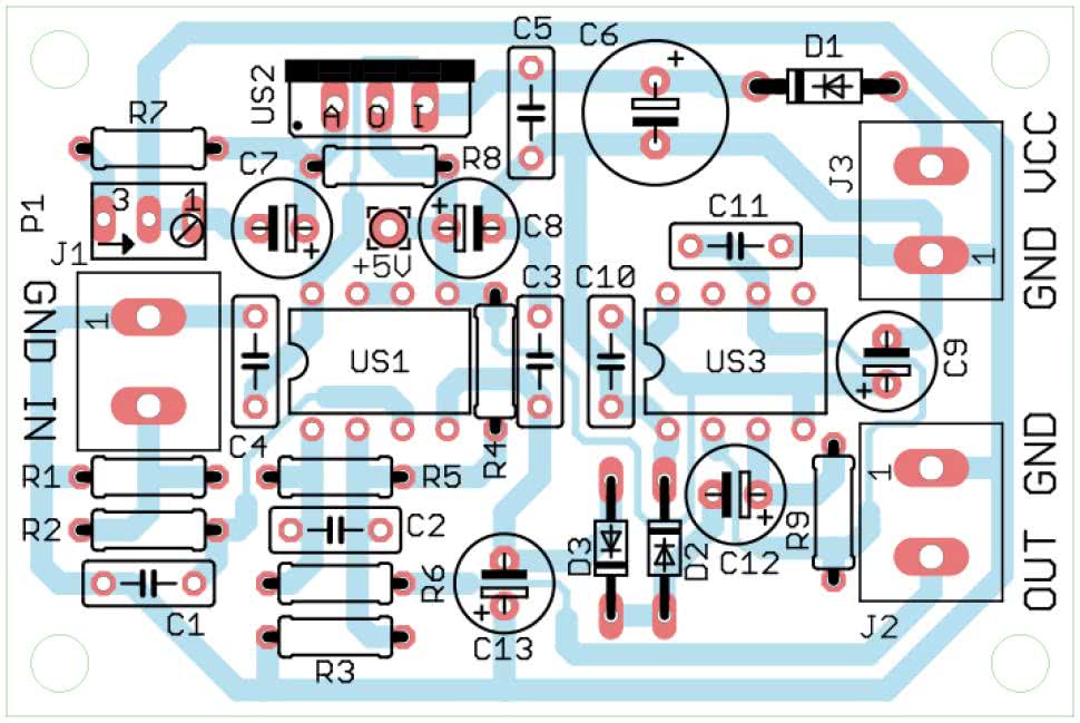 Układ został zmontowany na jednostronnej płytce drukowanej o wymiarach 60 mm×40 mm (rysunek 2). W odległości 3 mm od krawędzi płytki znalazły się cztery otwory montażowe, każdy o średnicy 3,2 mm.