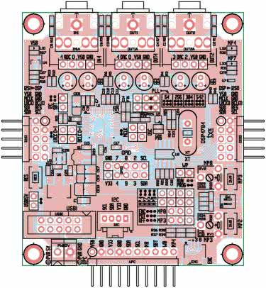 - BCLK, LRCK, MCLK, MP1, MP2, MP7, MP9, OSC, USBI5V, WP, SBT: złącze SIP 2 pin + jumper, proste 2,54 mm