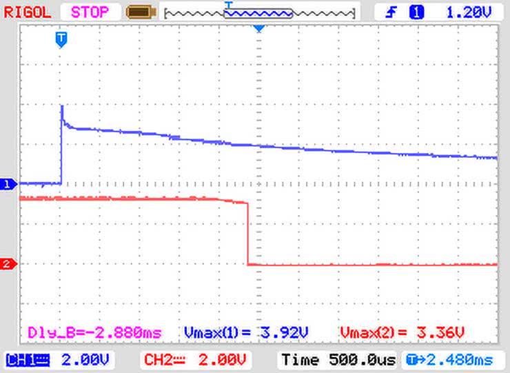 Po wlutowaniu elementów i zmyciu resztek topnika płytka nie wymaga specjalnego uruchamiania. Każdorazowo warto jednak sprawdzić obecność napięć zasilających. Po domyślnym ustawieniu zwory OSC w pozycji zwartej, wybraniu dzielnika 256 za pomocą zwory PLL (zgodnie z opisem na PCB) i usunięciu pozostałych zwór, można podłączyć do złącza PWR5V zasilacz 5 V/500 mA i sprawdzić obecność napięć 5 V, 3,3 V, 1,8 V w odpowiadających punktach układu oraz sprawdzić obecność sygnału zegarowego OSC zgodnego z użytym kwarcem (domyślnie 12,288 MHz). Warto sprawdzić poprawność działania układów: U3 generującego sygnał resetu RES oraz U4 generującego sygnał WB. Podczas zaniku zasilania 5 V powinna być możliwa do zaobserwowania sekwencja sygnałów WB (niebieski) i RES (czerwony) zgodnie z rysunkiem 5.