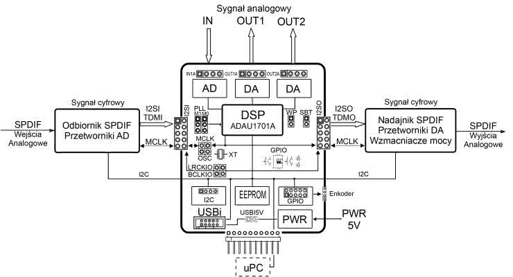 Schemat blokowy zestawu, ilustrujący przepływ sygnałów audio, sterujących oraz połączenia pomiędzy poszczególnymi modułami pokazano na rysunku 2, natomiast schemat ideowy zestawu DSP1701A_DSP_MK2 – na rysunku 3.