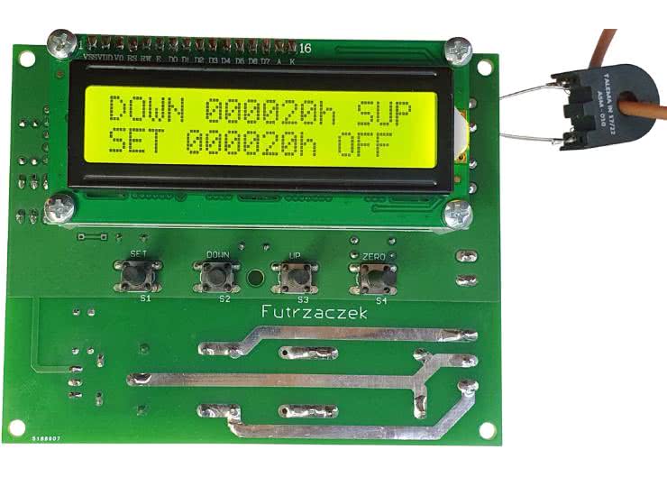 Poprawnie zaprogramowany układ jest gotowy do działania po ustawieniu kontrastu wyświetlacza potencjometrem P2. Do zasilania należy zastosować źródło napięcia stałego o wartości około 12 V (dopuszczalny przedział 10…16 V uwzględnia zakres prawidłowej pracy przekaźnika, z uwzględnieniem spadku napięcia na przewodzącej diodzie D2 i nasyconym tranzystorze T1 w temperaturze 20°C). Warto, aby owe napięcie było dobrze filtrowane, a jeszcze lepiej stabilizowane. Pobór prądu ze źródła napięcia 12 V wynosi około 10 mA przy wyłączonym przekaźniku oraz około 40 mA, kiedy cewka zostanie załączona. Trzeba zadbać o to, aby napięcie szybko zanikało w momencie wyłączenia zasilania, tak by układ wykrył jego zanik i zdążył z zapisem odmierzonego czasu do EEPROM.
