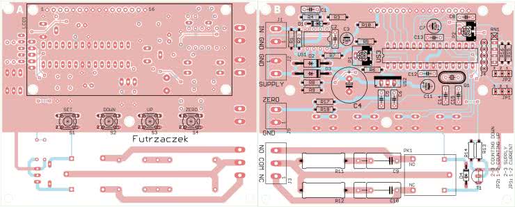 Układ został zmontowany na dwustronnej płytce drukowanej o wymiarach 100 mm × 80 mm. Jej wzór ścieżek oraz schemat montażowy pokazano na rysunku 2. W odległości 3 mm od krawędzi płytki znalazły się cztery otwory montażowe, każdy o średnicy 3,2 mm.