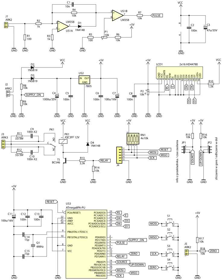 Schemat ideowy omawianego układu znajduje się na rysunku 1. Do pomiaru czasu i obsługi wyświetlacza służy mikrokontroler US2 typu ATmega8A. Ten popularny model procesora pozostaje w ciągłej produkcji, ponadto ma wystarczające peryferia do realizacji tego zadania. Jego rdzeń jest taktowany sygnałem o częstotliwości 4 MHz, dla którego wzorcem jest rezonator kwarcowy Q1. Wbudowany w mikrokontroler generator wzbudza drgania kryształu kwarcu, przez co układ może odmierzać czas z dużą dokładnością, co jest jego głównym zadaniem. Kondensatory 15 pF ułatwiają wzbudzenie oscylacji Q1. Nieopodal jego wyprowadzeń zasilania znajdują się cztery kondensatory, które filtrują napięcie zasilające z tętnień o szerokim widmie częstotliwościowym. Ich źródłem mogą być zarówno tranzystory wchodzące w skład struktury US2, jak i okoliczne elementy.