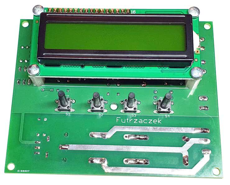Na drugiej stronie płytki znajduje się miejsce na wyświetlacz LCD1 oraz cztery przyciski S1…S4. Ich lokalizację po przylutowaniu pokazuje fotografia 2.