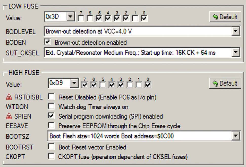 Szczegóły są widoczne na rysunku 4, który zawiera widok okna konfiguracji tychże bitów z poziomu programu BitBurner. W ten sposób zostanie uruchomiony wbudowany generator obsługujący rezonator kwarcowy o średniej częstotliwości drgań oraz Brown-Out Detector, który wprowadzi mikrokontroler w stan zerowania, jeżeli jego napięcie zasilające spadnie poniżej 4 V. Taka konfiguracja znacznie zmniejsza ryzyko zawieszenia się układu podczas uruchamiania – zwłaszcza wtedy, gdy napięcie zasilające narasta powoli.