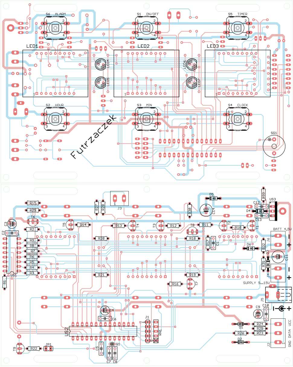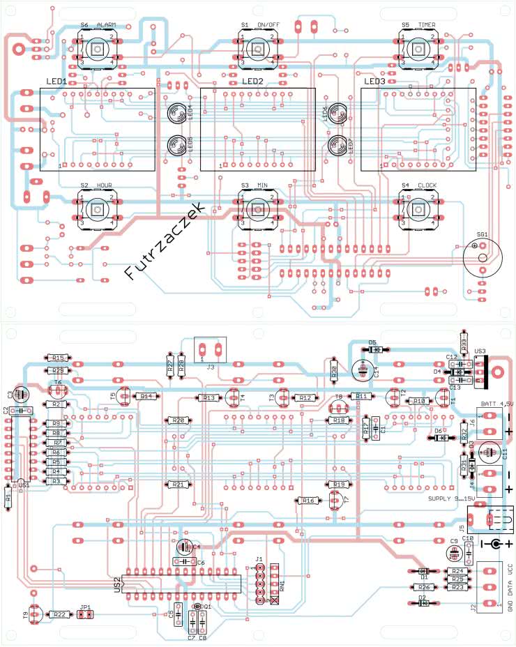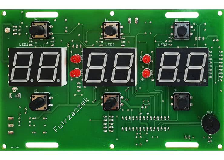 Po wlutowaniu tych elementów, skontrolowaniu poprawności montażu i starannym przycięciu wystających końcówek należy wlutować podzespoły na wierzchniej stronie płytki (Top). Są to: wyświetlacze, diody LED, przyciski i sygnalizator dźwiękowy. Część pól lutowniczych, które zostały już obsadzone elementami, zostanie przykryta przez wyświetlacze, stąd konieczność zachowania takiej kolejności montażu. W przeciwnym razie byłoby to zadanie znacznie utrudnione. Zmontowany układ od strony wierzchniej widać na fotografii tytułowej, z kolei tę samą płytkę od strony spodniej można zobaczyć na fotografii 1.