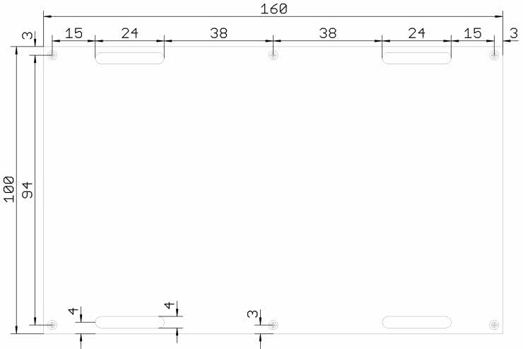 Rysunek 4 zawiera szczegółowe informacje dotyczące rozmieszczenia otworów montażowych na powierzchni płytki. Wśród nich jest sześć otworów okrągłych o średnicy 3,2 mm, które znajdują się w rogach płytki oraz na środkach jej dłuższych krawędzi. Poza tym na PCB zostały umieszczone cztery podłużne otwory z zaokrąglonymi rogami, które można wykorzystać do przyczepienia płytki parcianymi lub skórzanymi pasami do imitacji ładunku wybuchowego. Nic też nie stoi na przeszkodzie, by skorzystać z nich jako klasycznych otworów montażowych pod śruby M4.