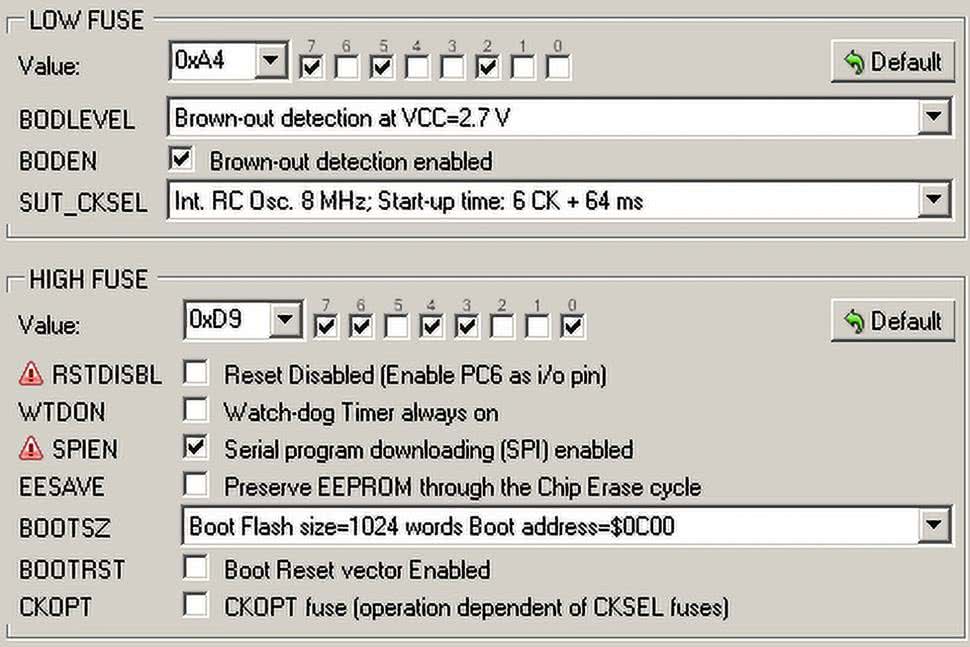 Na etapie uruchamiania konieczne jest zaprogramowanie pamięci Flash mikrokontrolera dostarczonym wsadem oraz zmiana ustawień fusebitów. Oto ich nowe wartości: