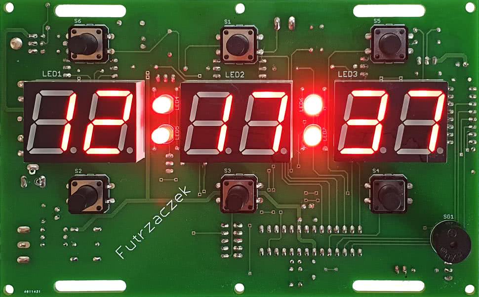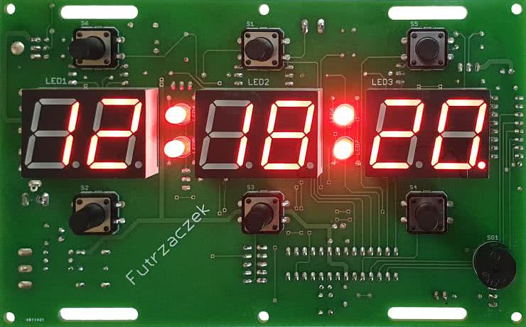 Ostatnia funkcjonalność prezentowanego układu to timer. Ustawia się go poprzez przytrzymanie przycisku S5 (TIMER) oraz wciskanie jednego z przycisków S2 (HOUR) lub S3 (MIN), które inkrementują, jak poprzednio, liczbę godzin lub minut. Na wyświetlaczach będzie ustawiona liczba godzin i minut, a liczba sekund zawsze będzie zerem. Uruchomienie odliczania czasu w dół odbywa się tak samo, jak włączenie budzika, czyli po krótkim wciśnięciu przycisku S1 (ON/OFF) podczas trzymania wciśniętego S5 (TIMER). Czas będzie liczony w dół sekunda po sekundzie, co będą również sygnalizowały migające dwukropki. Kiedy układ dojdzie do stanu 00:00:00, włączy ciągły dźwięk sygnalizatora – można to przyrównać do „wybuchu” bomby. Wcześniejsze anulowanie odliczania też jest możliwe, wystarczy wcisnąć na chwilę S1 (ON/OFF). Podobnie dzieje się z powrotem do normalnej pracy po zakończeniu odliczania.