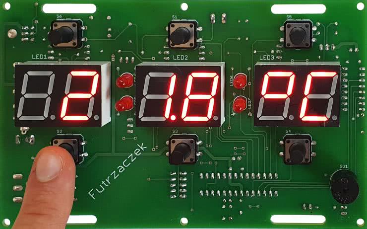 Jeżeli zostanie wciśnięty przycisk S2 (HOUR) lub S3 (MIN), na wyświetlaczach od razu pokaże się aktualna temperatura zmierzona czujnikiem – fotografia 3. Dwukropki gasną. Rozdzielczość pomiaru wynosi 0,1ºC w przedziale –55…+99,9ºC oraz 1ºC dla temperatury 100ºC lub wyższej. Wynik pomiaru zawsze jest prezentowany w stopniach Celsjusza. Odświeżanie tej wartości następuje co 1 s. W przypadku błędnego podłączenia czujnika bądź jego uszkodzenia zamiast cyfr pokażą się poziome kreski. Taka sama sytuacja wystąpi przez kilka sekund po włączeniu zasilania, kiedy układ testuje komunikację z czujnikiem. Po zwolnieniu trzymanego przycisku układ wraca do wyświetlania czasu.