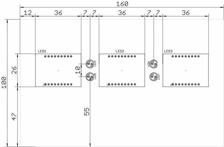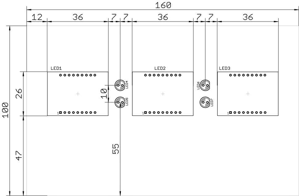 Na rysunku 5 znajduje się rozmieszczenie sześciu przycisków monostabilnych i sygnalizatora akustycznego. Z kolei rysunek 6 zawiera położenie wyświetlaczy LED oraz diod elektroluminescencyjnych, które pełnią funkcję dwukropków. Dzięki tym rysunkom można precyzyjnie wyciąć otwory pod poszczególne elementy oraz ulokować półprzezroczysty filtr dla podzespołów optoelektronicznych na przedniej ściance obudowy.