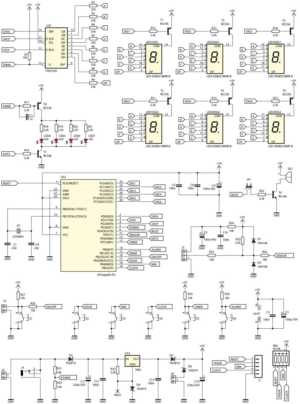 Sześć wyświetlaczy siedmiosegmentowych LED jest sterowanych multipleksowo. Poszczególne segmenty każdej cyfry załącza rejestr przesuwny typu 74HC595, zaś kolejne cyfry są zasilane przez klucze tranzystorowe T1…T6. Wejście OE (Output Enable) zostało podciągnięte do wysokiego stanu logicznego przy użyciu rezystora R1, przez co tuż po włączeniu zasilania nie jest zauważalne nieestetyczne mignięcie cyfr – ich katody są wówczas po prostu odłączone.