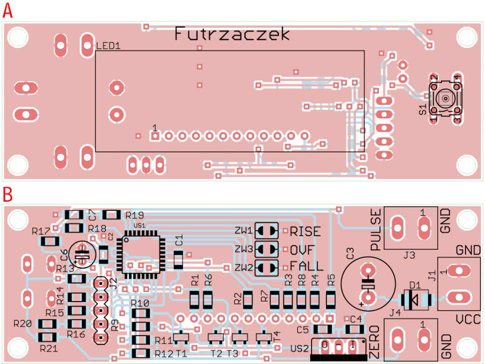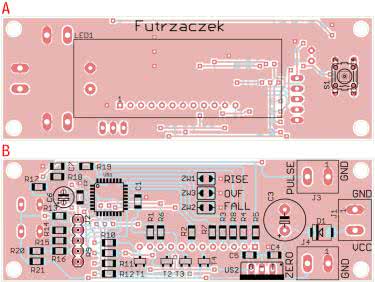 Układ został zmontowany na dwustronnej płytce drukowanej o wymiarach 90 mm × 30 mm. Jej wzór ścieżek oraz schemat montażowy pokazano na rysunku 2. Otwory montażowe mają średnicę 3,2 mm i znajdują się w odległości 3 mm od krawędzi płytki.
