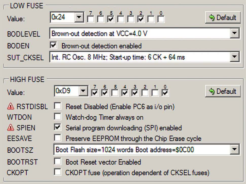 Szczegóły są widoczne na rysunku 3, który zawiera widok okna konfiguracji tychże bitów z programu BitBurner. Nowe ustawienia uruchomią wbudowany generator RC o częstotliwości 8 MHz oraz Brown-Out Detector, który wprowadzi mikrokontroler w stan zerowania, jeżeli napięcie zasilające spadnie poniżej 4 V, co znacznie zmniejszy ryzyko zawieszenia się mikrokontrolera podczas uruchamiania.