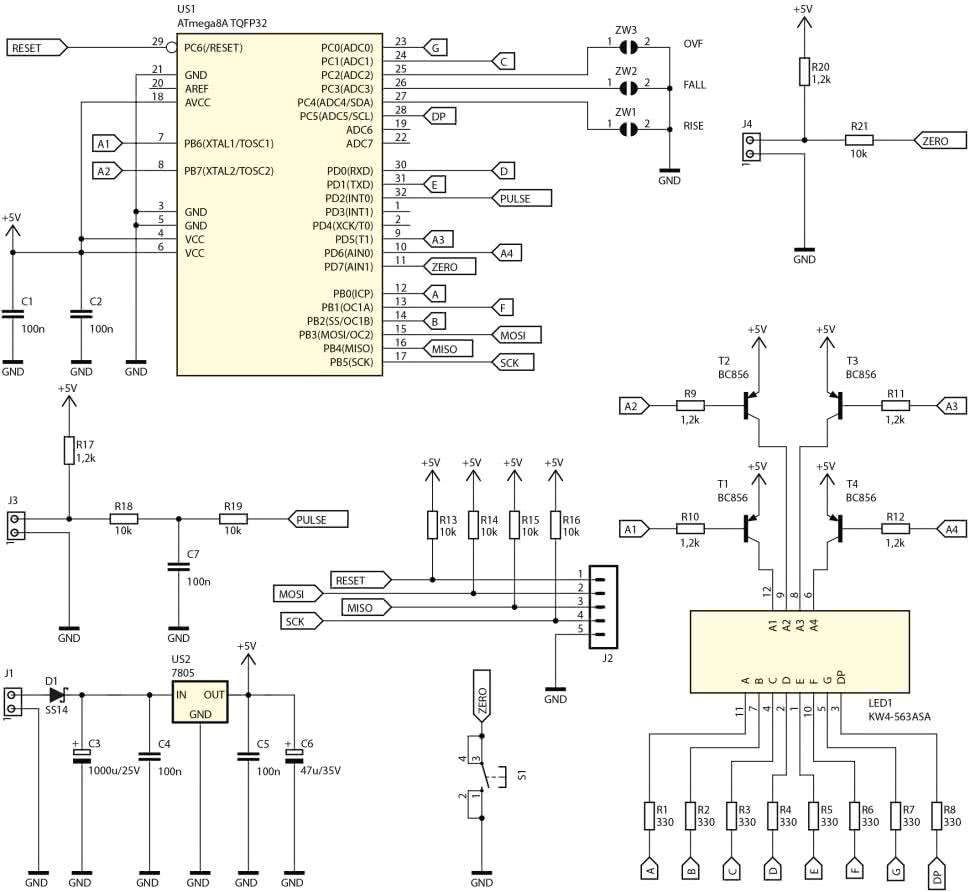 Schemat ideowy omawianego układu znajduje się na rysunku 1. Sercem urządzenia jest mikrokontroler typu ATmega8A z 8-bitowym rdzeniem AVR taktowanym sygnałem o częstotliwości 8 MHz, którego wzorcem jest wbudowany oscylator RC. Nie ma potrzeby stabilizacji częstotliwości sygnału zegarowego np. rezonatorem kwarcowym, ponieważ układ nie robi nic, co byłoby istotne z punktu widzenia dokładności w dziedzinie czasu. Użytkownik ma do dyspozycji trzy zworki SMD, które służą do wyboru sposobu zliczania impulsów i obsługi przepełnienia. Wbudowane w mikrokontroler rezystory podciągające zapewniają wysoki stan logiczny po rozwarciu tychże zworek.