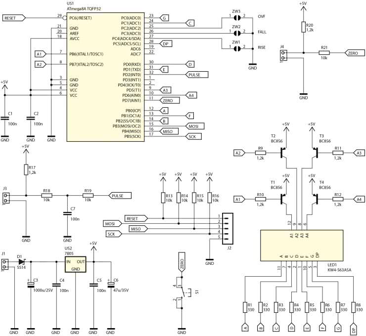 Użyty wyświetlacz ma cztery cyfry, z których każda jest złożona z siedmiu segmentów oraz kropki. Do jego pełnego wysterowania w trybie multipeksowym potrzeba zatem dwunastu wyprowadzeń mikrokontrolera, których ten ma aż nadto. Dzięki nadmiarowym liniom GPIO można było pominąć dodatkowe układy rozszerzające liczbę wyjść, które zwiększałyby ilość miejsca zajmowanego przez układ na powierzchni laminatu. Prąd pojedynczego segmentu wynosi około 10 mA, co zapewnia wysoką jasność świecenia wyświetlacza i jego dobrą czytelność nawet w niekorzystnych warunkach (zabrudzenie szybki obudowy, refleksy, silne oświetlenie itp.). Segmenty są sterowane bezpośrednio z wyprowadzeń mikrokontrolera, lecz całe cyfry muszą być obsługiwane przez klucze tranzystorowe T1…T4, ponieważ ich sumaryczny prąd może sięgać 80 mA, co jest wartością zbyt wysoką dla pojedynczego wyprowadzenia układu z serii ATmega.