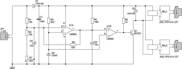 Na wyjściu komparatora znajduje się tranzystor, który jest w stanie wysterować przekaźniki wyjściowe. Cewki przekaźników są podłączone równolegle. Dioda D2 zabezpiecza tranzystor przed przepięciem w chwili wyłączania przekaźnika. Dioda D1 zabezpiecza układ przed odwrotnym podłączeniem zasilania podczas montażu.
