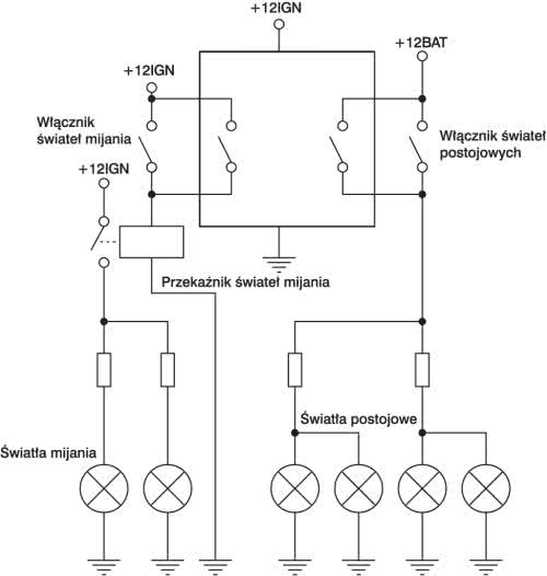 Obciążalność układu zależy od zastosowanych przekaźników. Dla proponowanych wynosi ona 10 A. Typowy obwód świateł postojowych nie pobiera więcej niż 2...3 A, natomiast zwykle w obwodzie świateł mijania znajduje się przekaźnik. Aby nie powodować przepływu dużego prądu zasilania świateł w modyfikowanej instalacji, warto go wykorzystać.