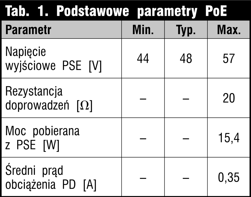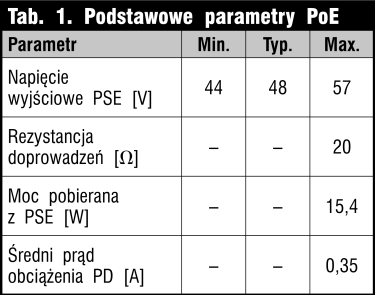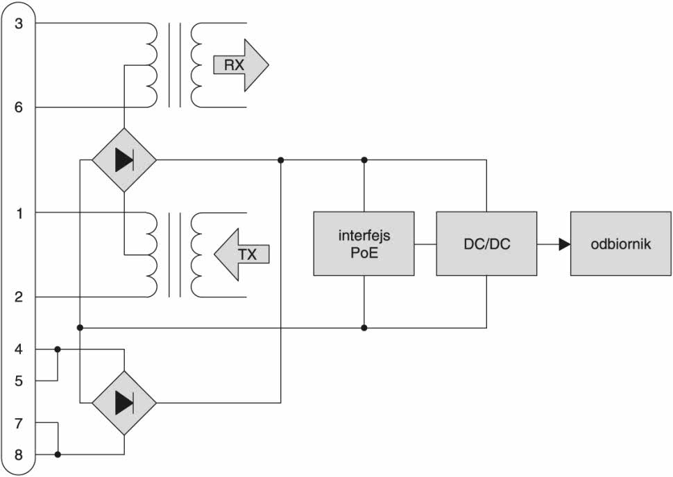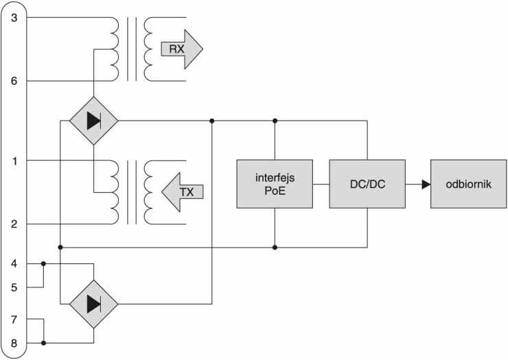 W typowym kablu sieciowym UTP do transmisji wykorzystywane są tylko 2 z 4 istniejących par przewodów sygnałowych. Pozostałe przewody pozostają niepodłączone. Można je więc użyć do zasilania urządzenia, które komunikuje się przez sieć. Ale należy to zrobić prawidłowo! Nowo przyjęta norma IEEE802.3af Power Over Ethernet (PoE) specyfikuje, które z przewodów RJ45 mogą być używane do przesyłania zasilania i jak należy to zrobić. Zazwyczaj na ten cel przeznacza się wolne linie 4-5 i 7-8, chociaż można także użyć linii sygnałowych 1-2 i 3-6, które typowo są przyłączone do wejść różnicowych transformatora (rys. 2).