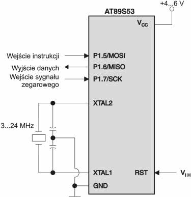 Jak to wcześniej napisano, podczas programowania mikrokontroler powinien być zasilany, powinien także pracować jego oscylator, co najczęściej oznacza dołączenie do wyprowadzeń XTAL zewnętrznego kwarcu. W czasie programowania układu za pomocą interfejsu SPI podstawowa konfiguracja mikrokontrolera zamontowanego w docelowym układzie powinna wyglądać tak jak na rys. 2. Jako przykład pokazano mikrokontroler AT89S52 z sygnałem zerowania aktywnym przy poziomie wysokim. Mikrokontrolery z grupy AVR są zerowane poziomem niskim. Przyporządkowanie linii interfejsu SPI do konkretnych wyprowadzeń poszczególnych układów można znaleźć w ich dokumentacji technicznej.