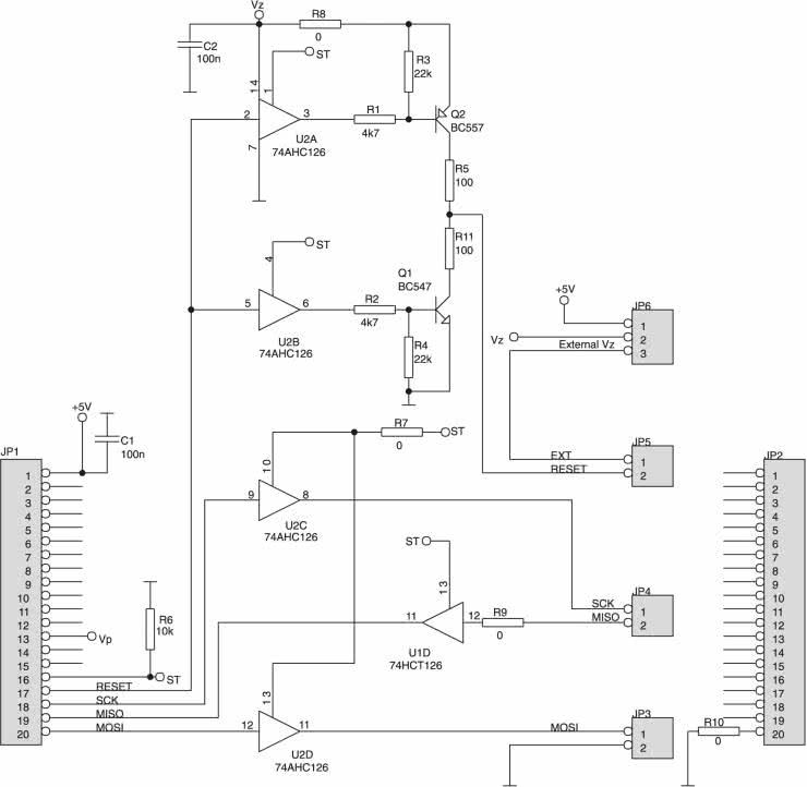 Schemat elektryczny przystawki pokazano na rys. 3. Składa się ona z bramek z wyjściem trójstanowym i z klucza tranzystorowego. Zadaniem bramek jest dopasowanie poziomów sygnałów programatora do poziomów akceptowanych przez programowany mikrokontroler oraz odcięcie wszelkich napięć, gdy programowanie dobiegnie końca. Dopasowanie poziomów sygnałów jest istotne w sytuacji, gdy programowany mikrokontroler pracuje w układzie o zasilaniu mniejszym niż +5 V. Jeżeli do budowy przystawki zastosujemy bramki z serii AHC lub LVHC, to uzyskamy niezbędną konwersję poziomów. Bramki te mają bowiem miłą cechę – przy zasilaniu napięciem o wartości od +3 do +5 V tolerują sygnały wejściowe o poziomie przewyższającym poziom napięcia zasilania. Jeżeli dokładnie obejrzymy schemat, to okaże się, że bramki U2A-D zasilane są napięciem Vz pobieranym ze styku 2 złącza JP6. Zależnie od potrzeb napięcie to może być pobierane z programatora i mieć wartość +5 V lub z układu, w którym pracuje programowany mikrokontroler, czyli ze styku JP6-3 oznaczonego jako External Vz. O źródle zasilania decyduje zwarcie odpowiednich styków JP6. Jeżeli układ, w którym pracuje mikrokontroler, jest zasilany napięciem +3,3 V, to taką samą wartość będzie miało napięcie External Vz zasilające bramki U2A-D. Pomimo że sygnały z programatora doprowadzone do wejścia tych bramek mają poziom TTL, na ich wyjściach sygnały będą miały wartości 0/3,3 V, czyli w pełni akceptowaną przez programowany mikrokontroler. Jedynym wyjątkiem jest bramka U1A typu HCT – na stałe zasilana +5 V. Bramka ta pełni rolę konwertera poziomu sygnału odczytywanego z programowanego mikrokontrolera. Ponieważ bramki z rodziny HCT prawidłowo współpracują z sygnałami z przedziału 2...5 V, sprawdzą się także w roli pośrednika pomiędzy programatorem a mikrokontrolerem zasilanym w przykładowym układzie napięciem +3,3 V.