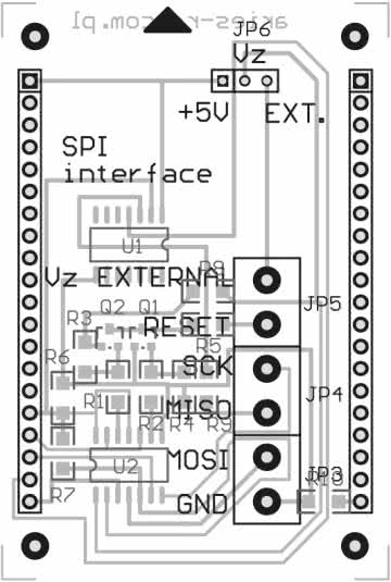 Bardzo wygodne jest umieszczenie na płytce drukowanej urządzenia, w którym pracuje programowany mikrokontroler, grzebienia z wyprowadzonymi liniami portu SPI. Ułatwi to dołączanie programatora i jest lepszym rozwiązaniem niż każdorazowe lutowanie przewodów do odpowiednich wyprowadzeń mikrokontrolera.
