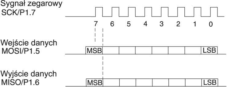 Na rys. 1 pokazano przebiegi czasowe sygnałów interfejsu. Dane są przesyłane po liniach MOSI i MISO bajt za bajtem z najstarszym bitem jako pierwszym. Z rysunku wynika, że kolejne bity danych wejściowych na linii MOSI są synchronizowane zboczem narastającym zegara SCK i gdy ma on poziom wysoki, nie powinny się zmieniać. Z kolei dane wyjściowe z mikrokontrolera można odczytywać tuż przed zboczem opadającym zegara SCK. Informacje na liniach MOSI i MISO mogą ulegać zmianie, gdy impuls zegara SCK ma poziom niski.