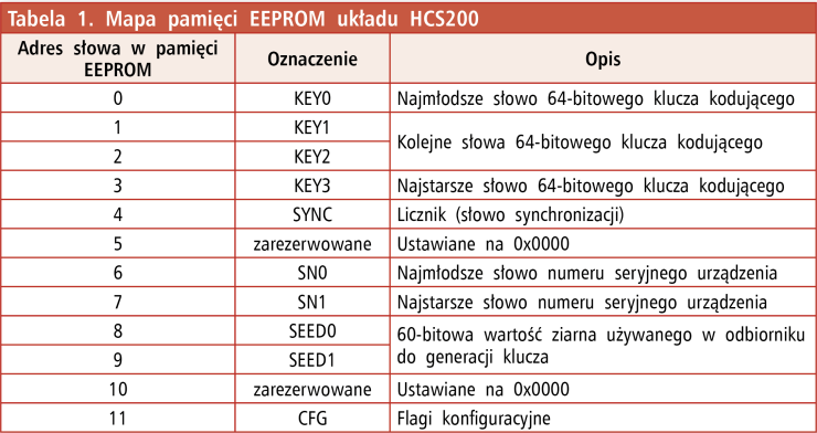 Pamięć układu składa się 12 słów (192 bajty). Mapę pamięci EEPROM układu HCS200 zamieszczono w tabeli 1.