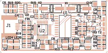 Sercem programatora jest mikrokontroler AT89C2051. Odpowiada on zarówno za komunikację z komputerem (RS232), jak i z programowanym układem. Programowanie może odbywać się bezpośrednio w nadajniku zdalnego sterowania przy użyciu klipsa. Tranzystor T1 kluczuje napięcie zasilające układy sterujące oraz programowany układ. Tranzystory T2 i T3 sterują linią danych natomiast tranzystory T4, T5 – linią zegarową. W trakcie weryfikacji dane wystawiane na linii danych przez programowany układ są odczytywane za pomocą wyprowadzenia P1.1 mikrokontrolera. Komendy sterujące programatorem oraz zawartość bufora danych są przesyłane z komputera na wyprowadzenia UART (P3.0 i P3.1) mikrokontrolera. W opisywanym interfejsie zastosowany jest wirtualny port szeregowy dostępny poprzez złącze USB komputera. Rozwiązaniem sprzętowym realizującym konwersję USB/UART jest tutaj układ U2 (FT232BL). Alternatywnie można zastosować konwerter MAX232 i połączyć programator z komputerem poprzez złącze RS232. Rozmieszczenie elementów na obwodzie drukowanym przedstawione zostało na rysunku 6.