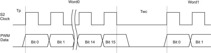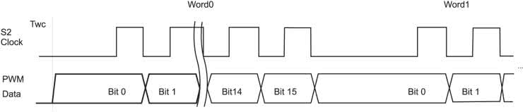 W pierwszym etapie układu jest wprowadzany w tryb programowania. Polega on na ustawieniu wyprowadzenia S2 układu (zegar), w czasie którego na wyprowadzeniu PWM (dane) są podawane kolejno poziomy: niski (3,5…4 ms), wysoki (co najmniej 3,5 ms) i ponownie niski (co najmniej 50 µs). Po wystąpieniu tych poziomów wyprowadzenie zegara jest zerowane i pozostaje w takim stanie przez czas Tp równy co najmniej 4 ms (rysunek 2).