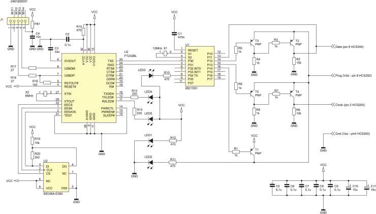 Układ HCS200 jest programowany za pomocą interfejsu dołączanego poprzez złącze USB do komputera PC pracującego pod kontrolą Windows. Interfejs zawiera konwerter USB/RS232. Możliwa jest rezygnacja z tej części układu i podłączenie programatora poprzez złącze RS232. Schemat interfejsu pokazano na rysunku 5.