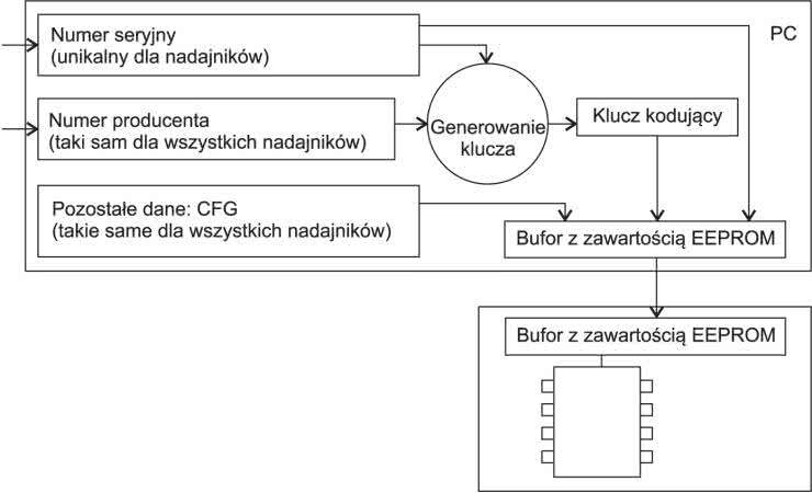 Oprogramowanie komputera oprócz komunikacji z interfejsem realizuje generowanie klucza kodującego (do pamięci EEPROM enkodera nie trafia numer producenta tylko wygenerowany klucz). Proces pokazano na rysunku 7.