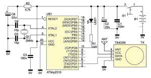 Schemat nadajnika pokazano na rysunku 1. Jego sercem jest mikrokontroler ATtiny2313. Wybrano go ze względu na wbudowany, sprzętowy, szeregowy interfejs UART, co pasowało do koncepcji rozwiązania i znacznie uprościło napisanie programu. Dla zapewnienia stałej częstotliwości sygnału taktującego praca UART (transmisja asynchroniczna), generator zegarowy mikrokontrolera współpracuje z zewnętrznym rezonatorem kwarcowym o częstotliwości 2 MHz. Interfejs UART jest dołączony do nadajnika TX433N pracującego w nielicencjonowanym paśmie ISM. Nadawanie jest sygnalizowane miganiem diody LED1. Obwód rezystor R2 – kondensator C6 powoduje opóźnia start mikrokontrolera po załączeniu napięcia zasilania, co pozwala na ustabilizowanie się warunków pracy przed rozpoczęciem wykonywania programu. Jak wspomniano, jako nadajnik zastosowano moduł TX433N dostępny w ofercie sklepu AVT. Małe wymiary, szeroki zakres napięcia zasilania (3...12 V) i nieskomplikowana aplikacja wręcz predysponują go do tego celu. Kondensatory C1...C3 zapobiegają rozprzestrzenianiu się zaburzeń po układzie.